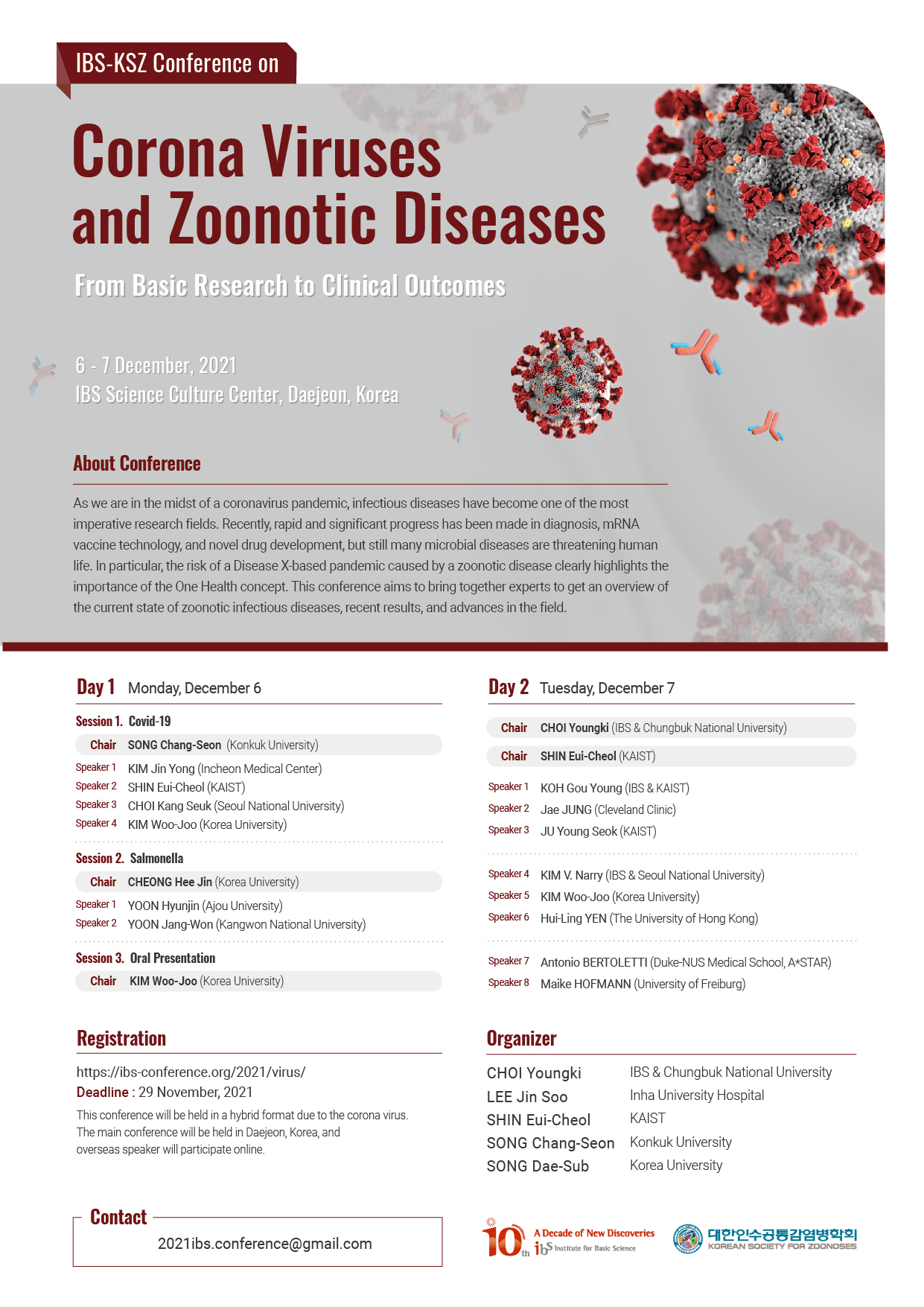 The IBS Korea Virus Research Institute and Korean Society for Zoonoses (KSZ) are jointly hosting the 2021 IBS-KSZ Conference on Corona Viruses and Zoonotic Diseases taking place 6-7 December 2021.