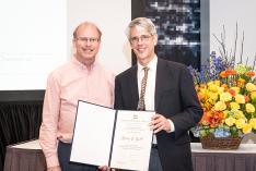 Prof. Rodney S. Ruoff, Distinguished Professor of UNIST and Director of the IBS CMCM, gave the Plenary Lecture at APS March 2018 held in L.A., USA. Prof. Ruoff has been awarded the James C. McGroddy Prize for New Materials from the American Physical Society in recognition of his outstanding achievement in the science and application of new materials. *Photo(1) & Photo(2): Prof. Ruoff receives the prestigious James C. McGroddy Award from American Physical Society President Roger Falcone of UC Berkeley. *Photo(3): Prof. Ruoff thanks his coauthors and thus students, postdocs, and collaborators who have worked with him through his career, his family, and UNIST and the IBS. *Photo(4): Prof. Ruoff and other American Physical Society award recipients after the award ceremony at the 2018 March APS Meeting held in Los Angeles.