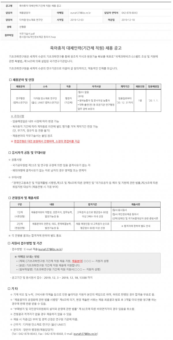 육아휴직 대체인력(기간제 직원) 채용 공고