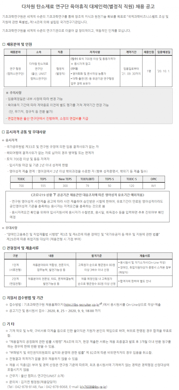 연구단 육아휴직 대체인력(별정직 직원) 채용 공고