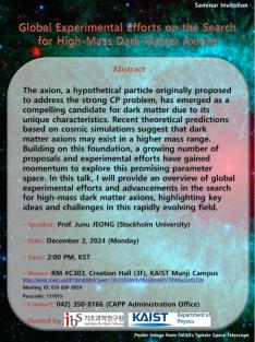 IBS/CAPP reported on our state of the art Axion Dark Matter experiments by Woohyun Chung, the superconducting cavity in strong B-fields by Danho Ahn, high frequency-high efficiency cavity designs by SungWoo Youn and OhJoon Kwon.